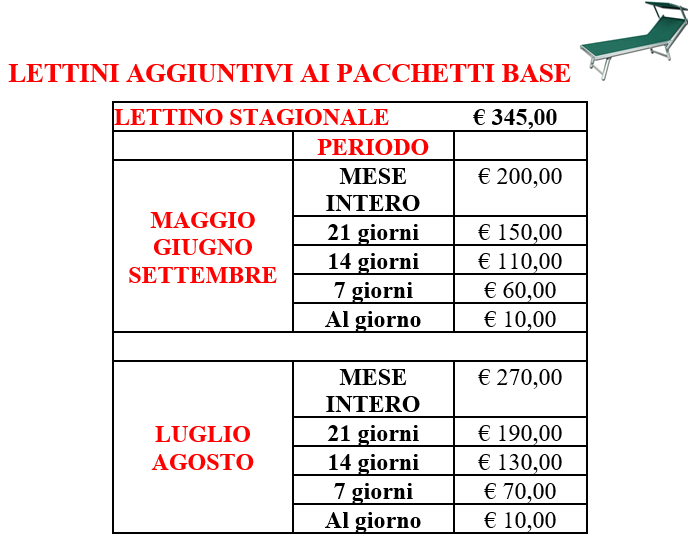 E' variato SOLO il listino prezzi del lettino aggiuntivo al pacchetto base (NON E' VARIATO IL PREZZO DEL LETTINO AGGIUNTIVO STAGIONALE).